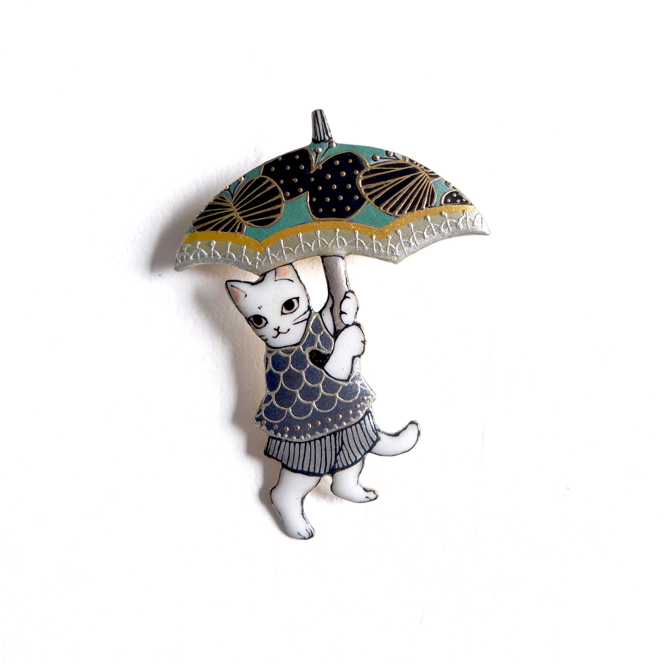 傘の繊細な表現と傘をさす猫の愛らしいしぐさに心癒される作品です。