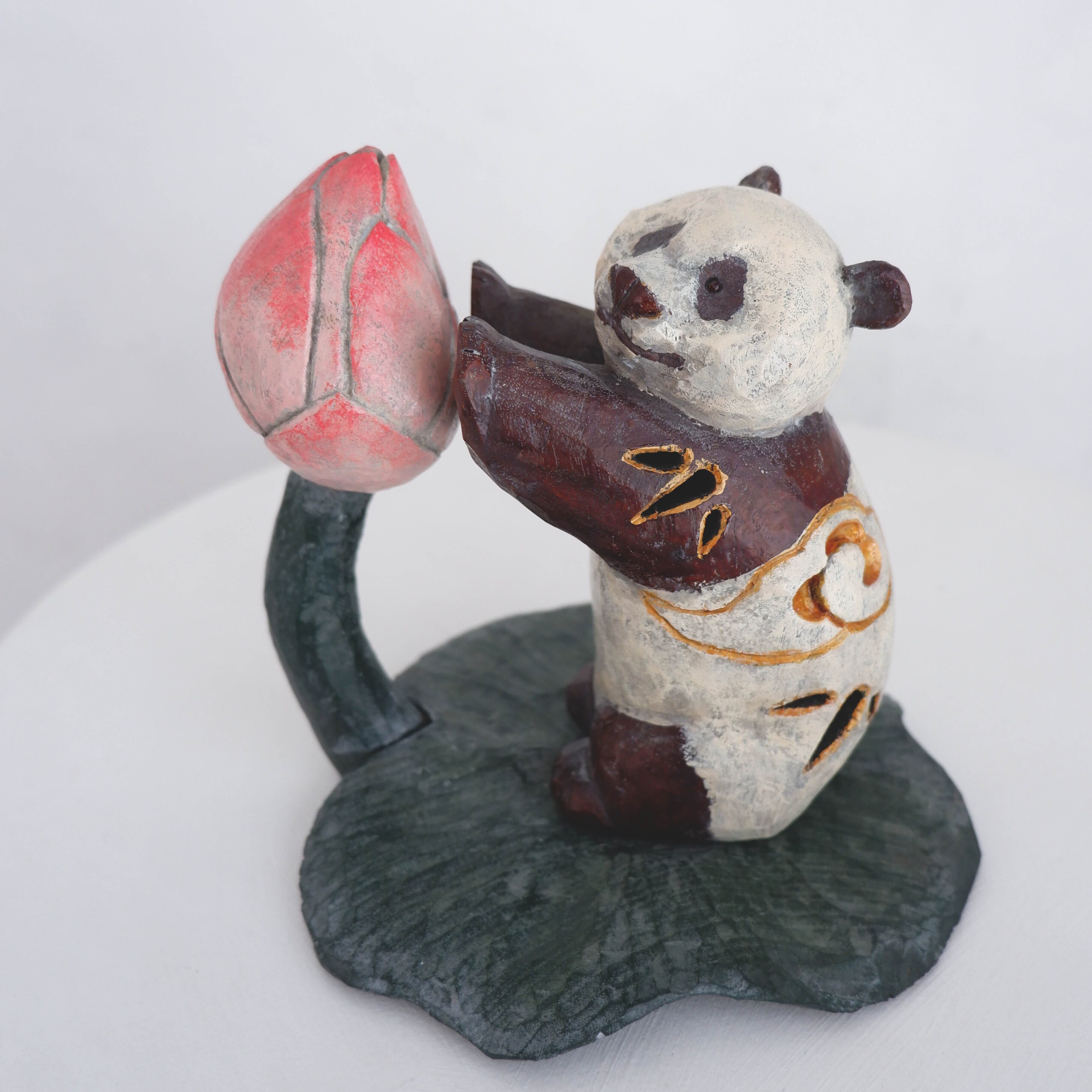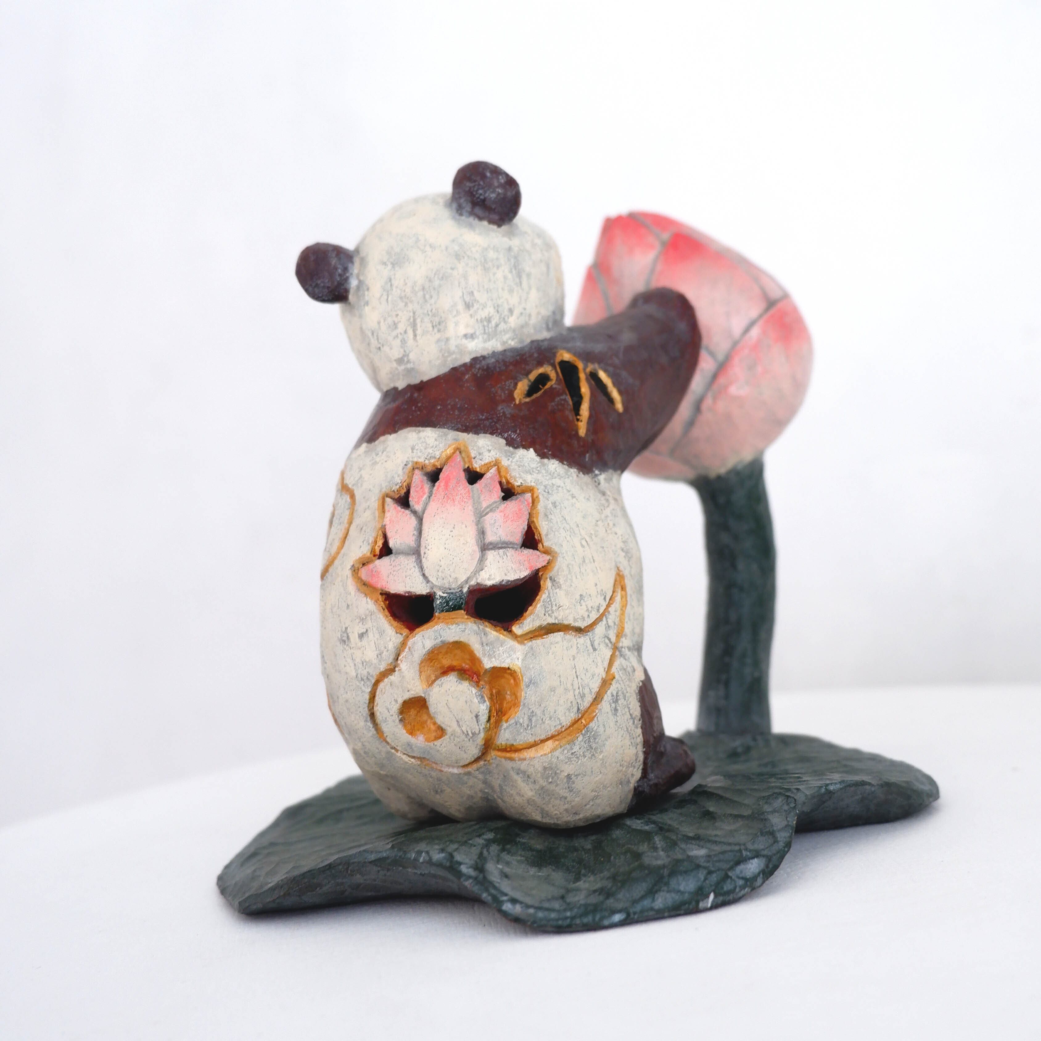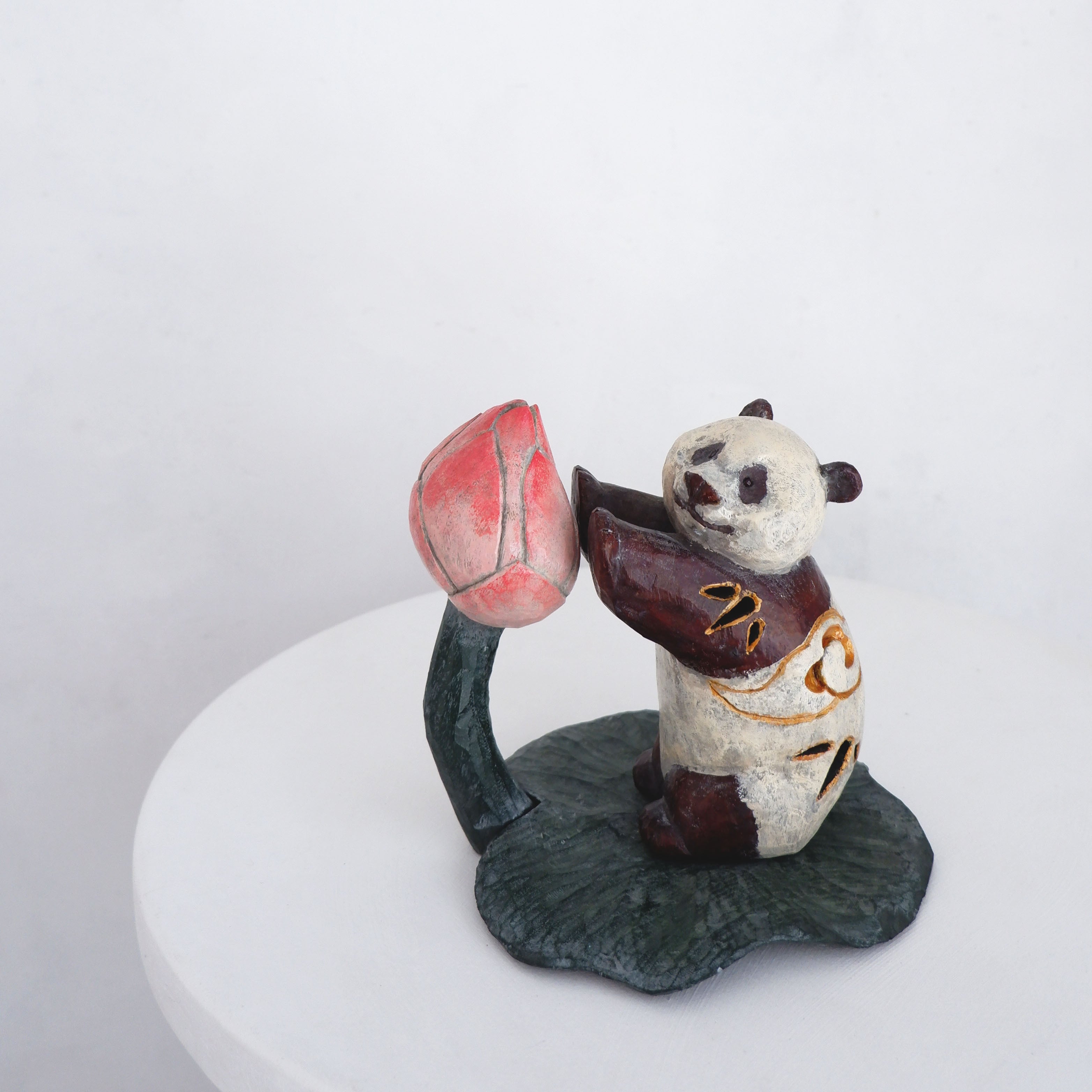 「パンダ」を神聖な存在として表現し、蓮の葉に乗り、花に手を伸ばすパンダの愛らしさと背中の透かし彫りが美しい作品です。
