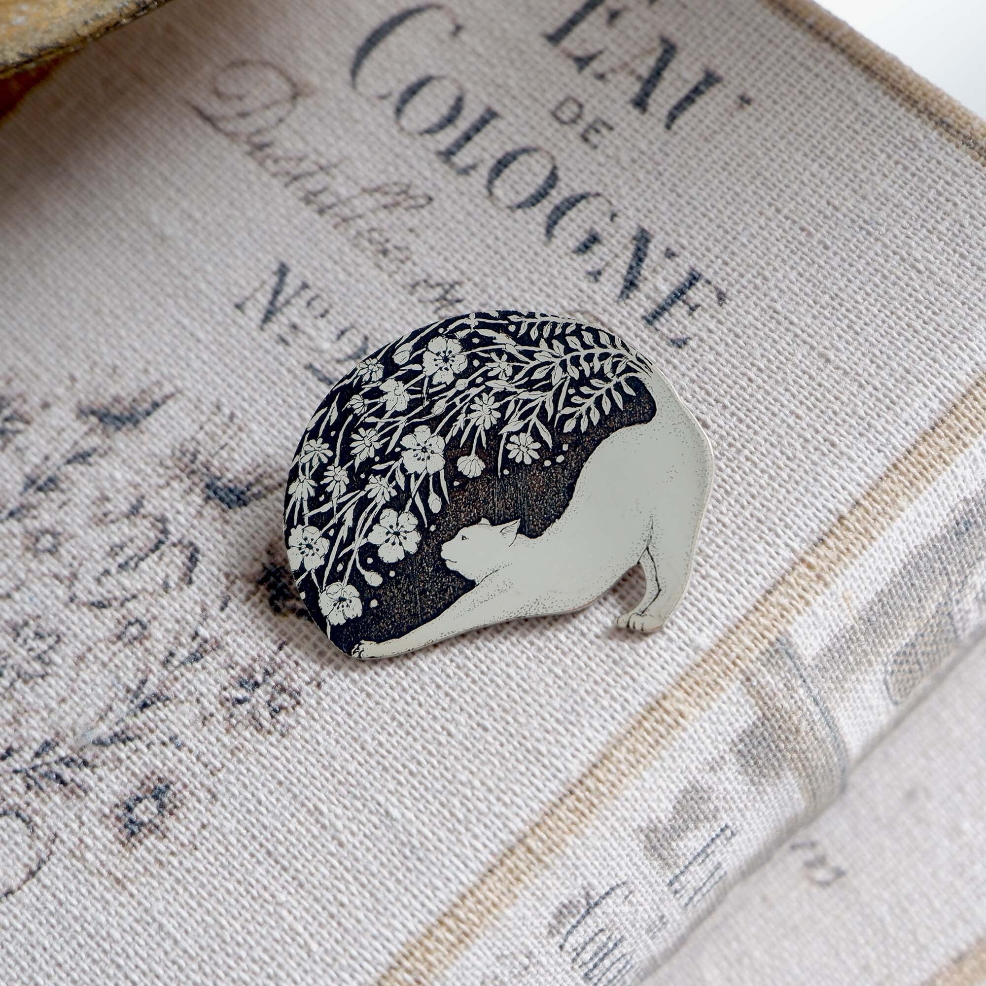 猫のしなやかなフォルムと、しっぽから育つ繊細な花々の美しい作品です。