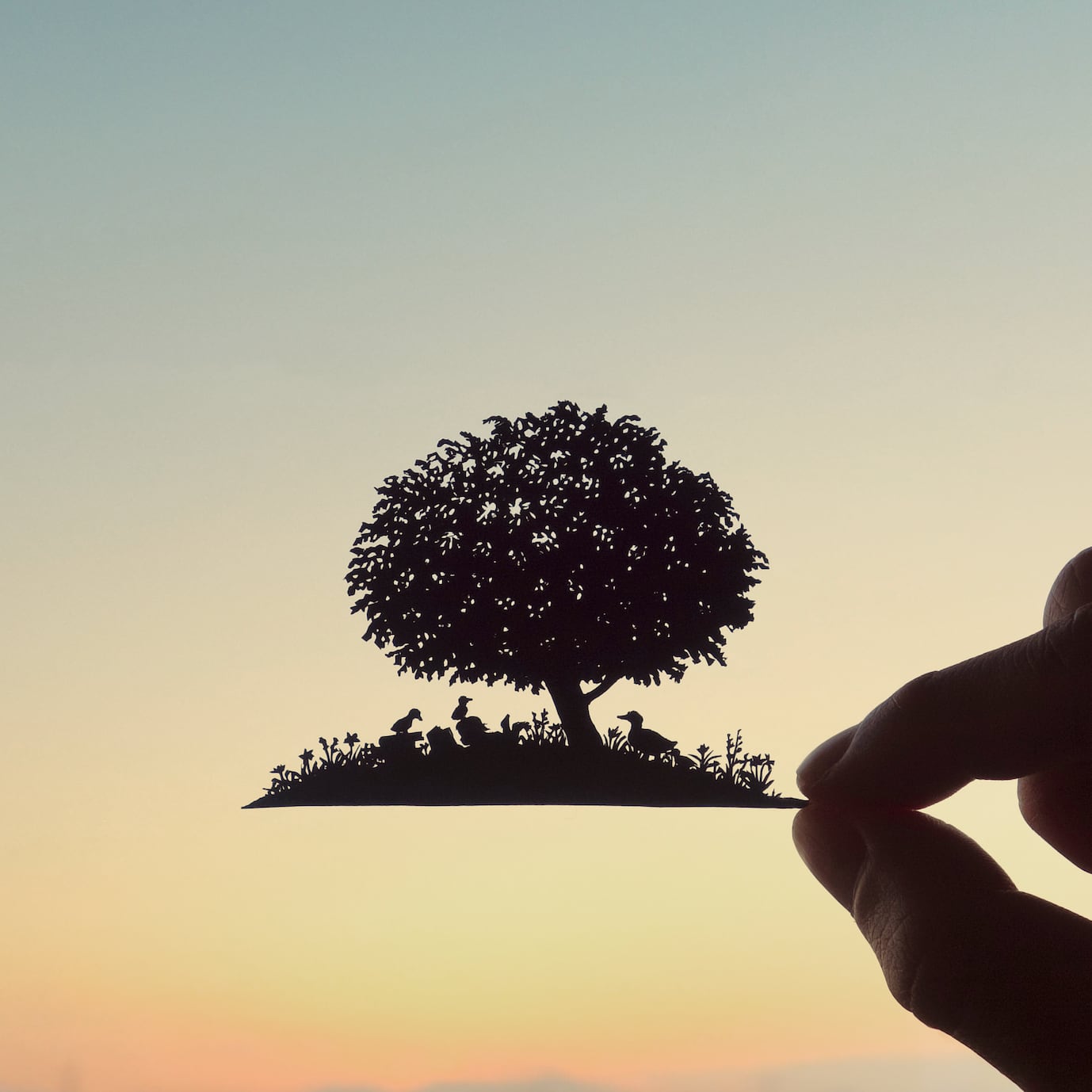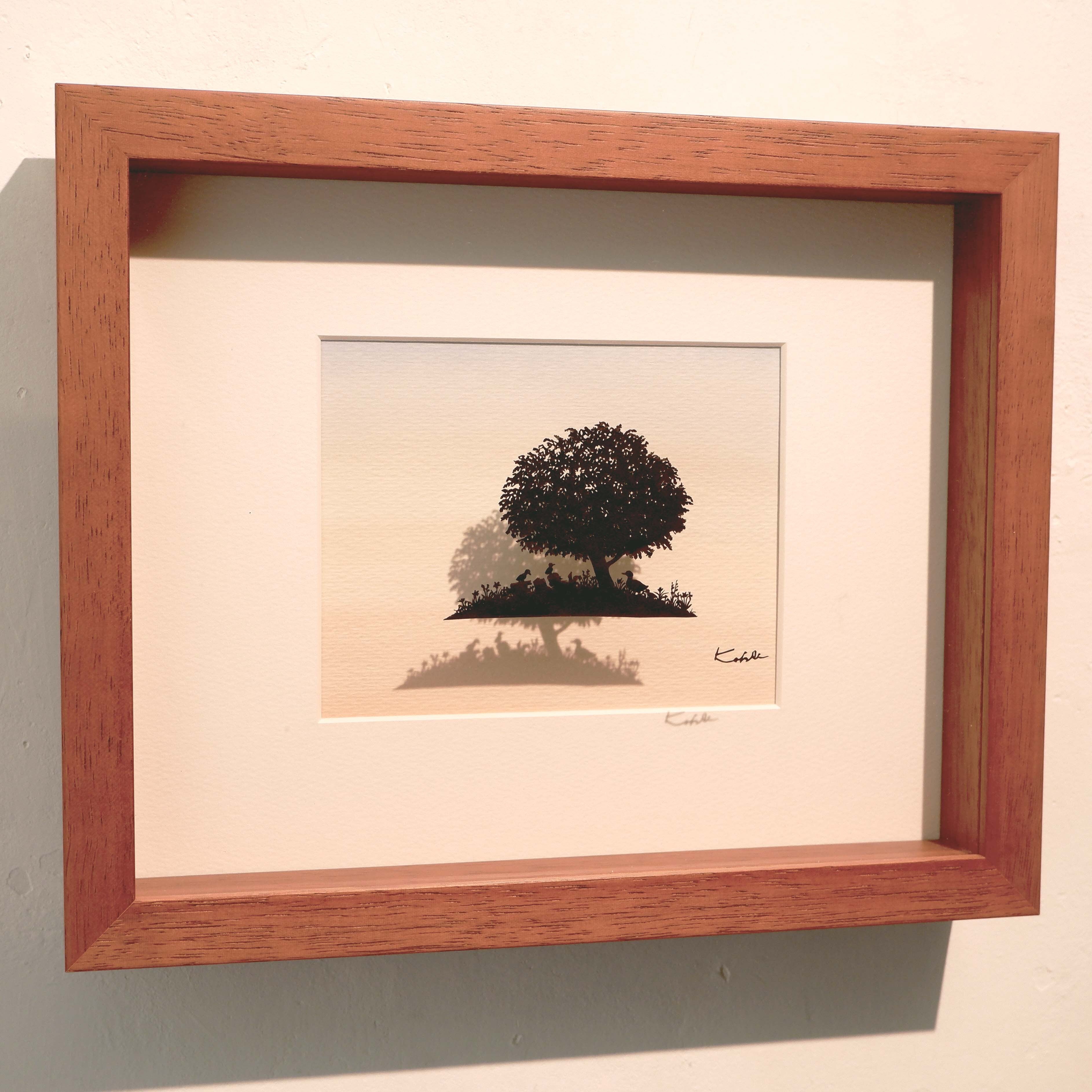 下絵を描かず、ハサミのみで繊細で叙情的な小さな世界を切り絵で表現する河野耕平さん。