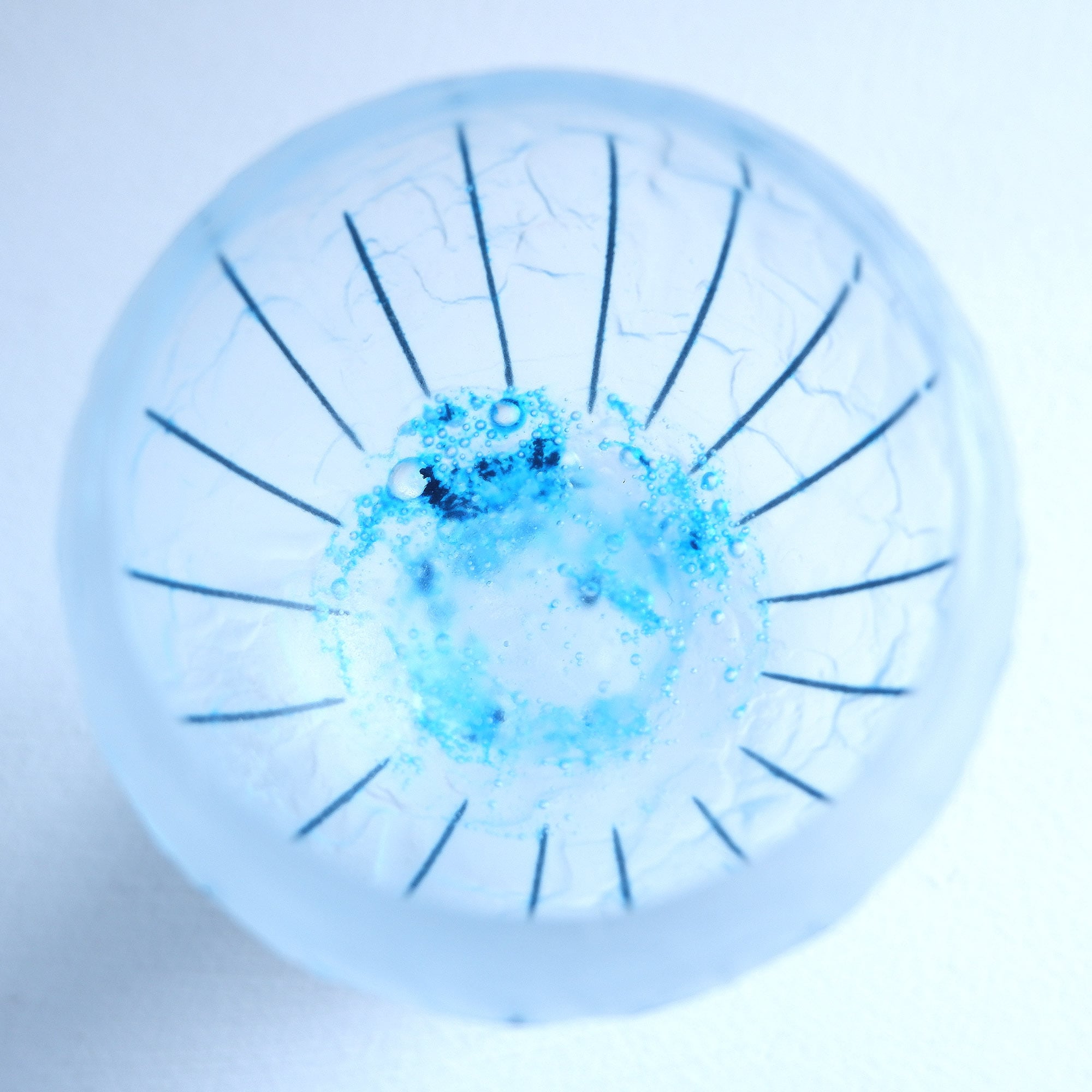 クリアなガラスの中で浮遊する真鍮の泡や青の断片、