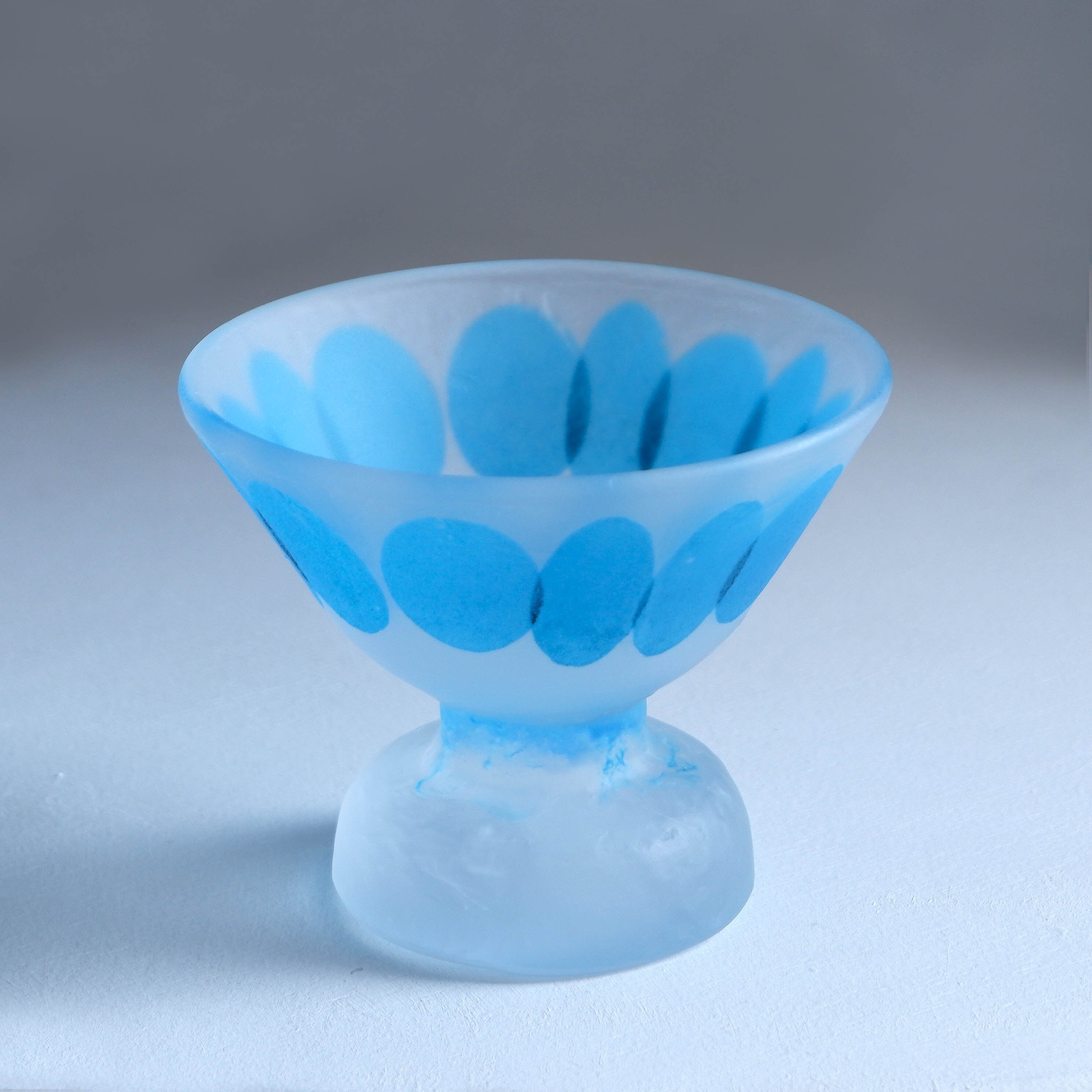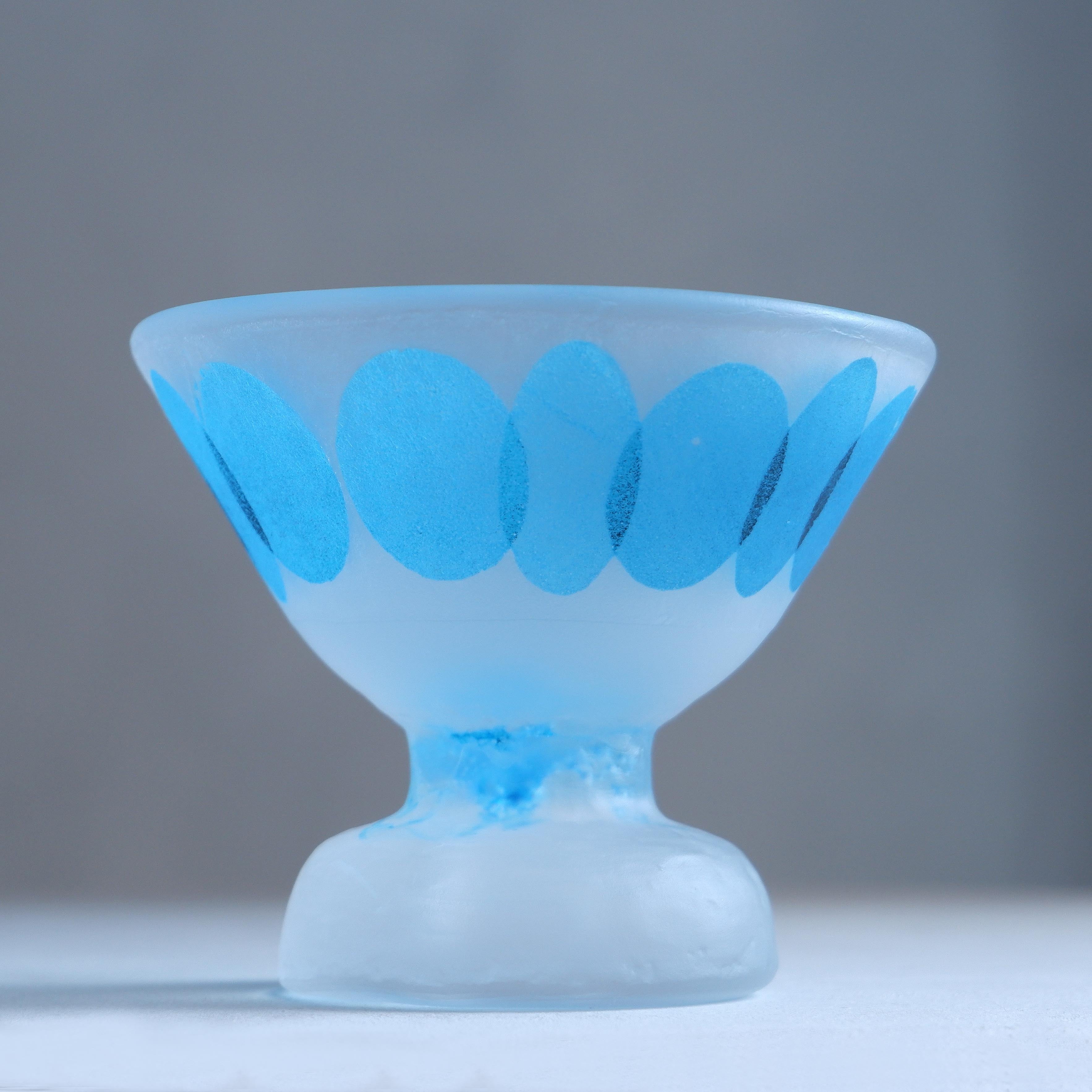 クリアなガラスの中で浮遊する真鍮の泡や青の断片、
