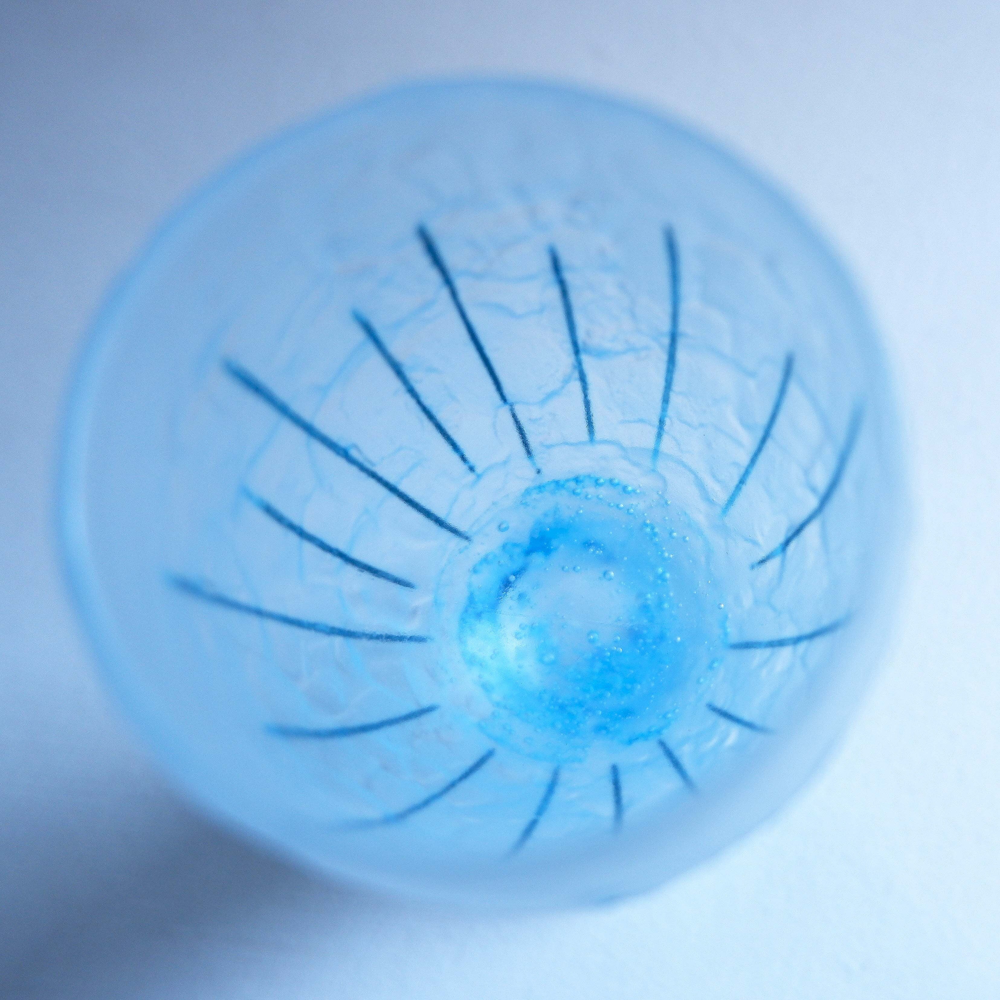 クリアなガラスの中で浮遊する真鍮の泡や青の断片、