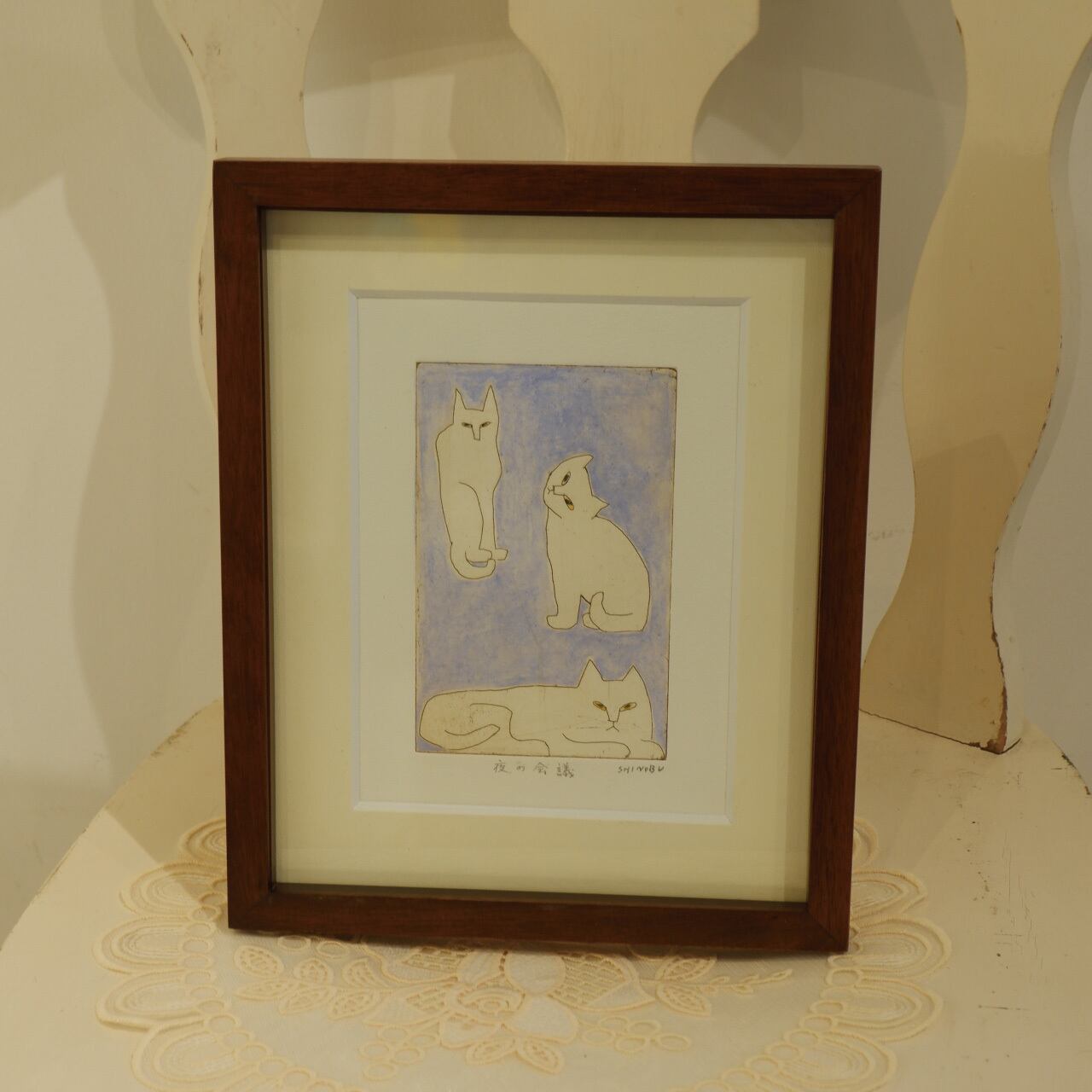 3ひきの猫たちの表情と無駄のないタッチで描かれたフォルムが秀逸な作品です。