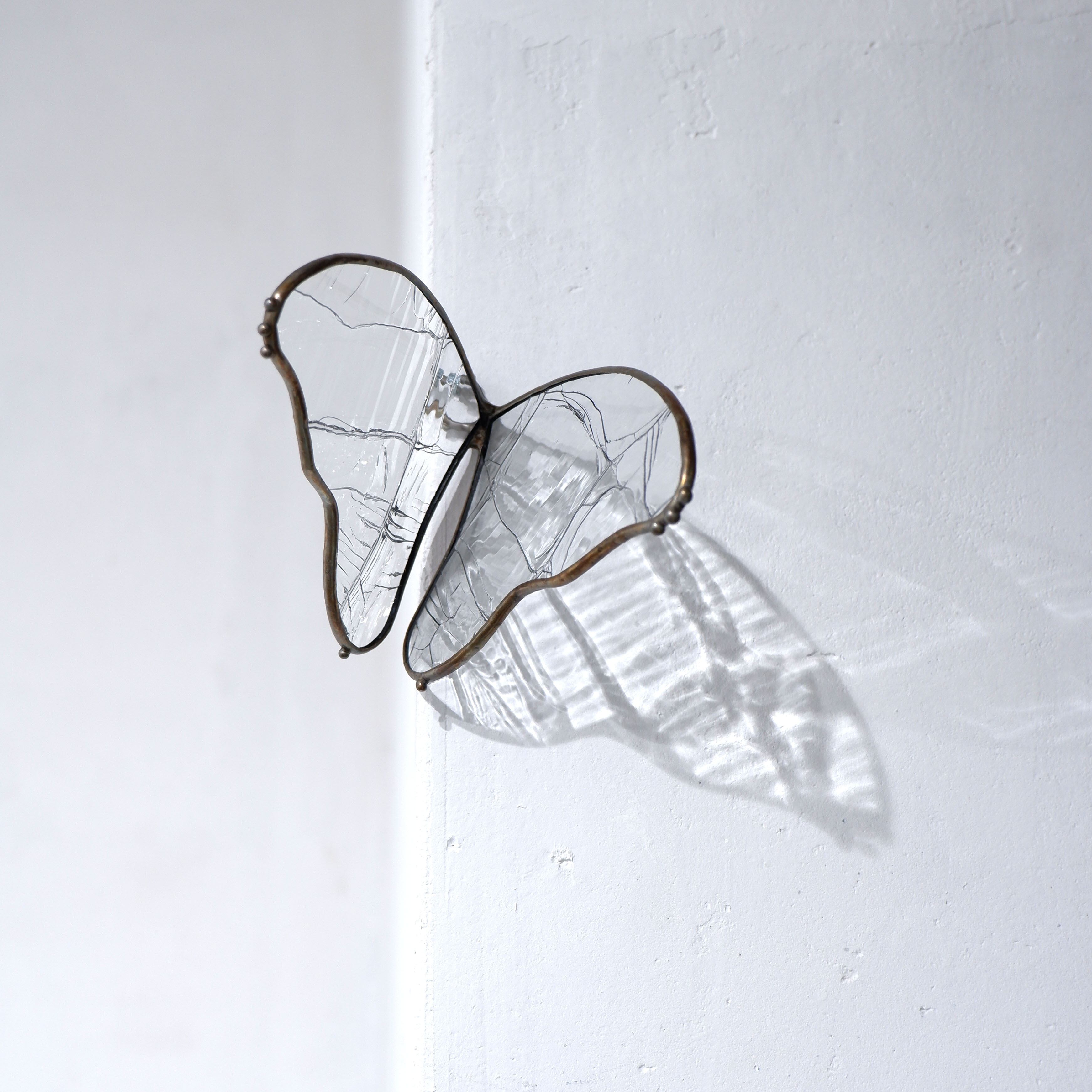 ステンドグラスの技法を用いて、存在するものと消えゆくものの間(あわい)を光と影で表現することを願っています。この度の展示はより思考を深め形を見つめて製作しました。