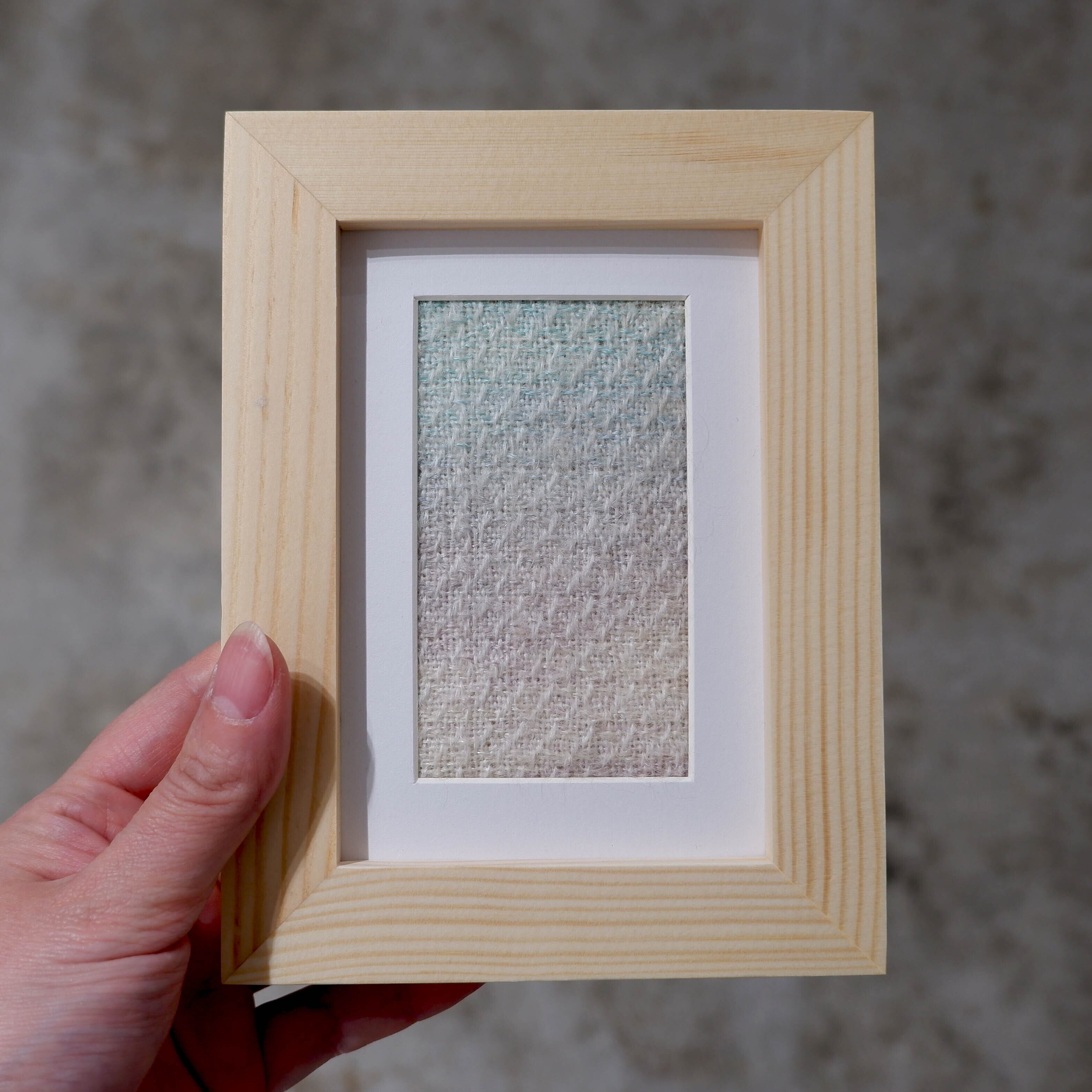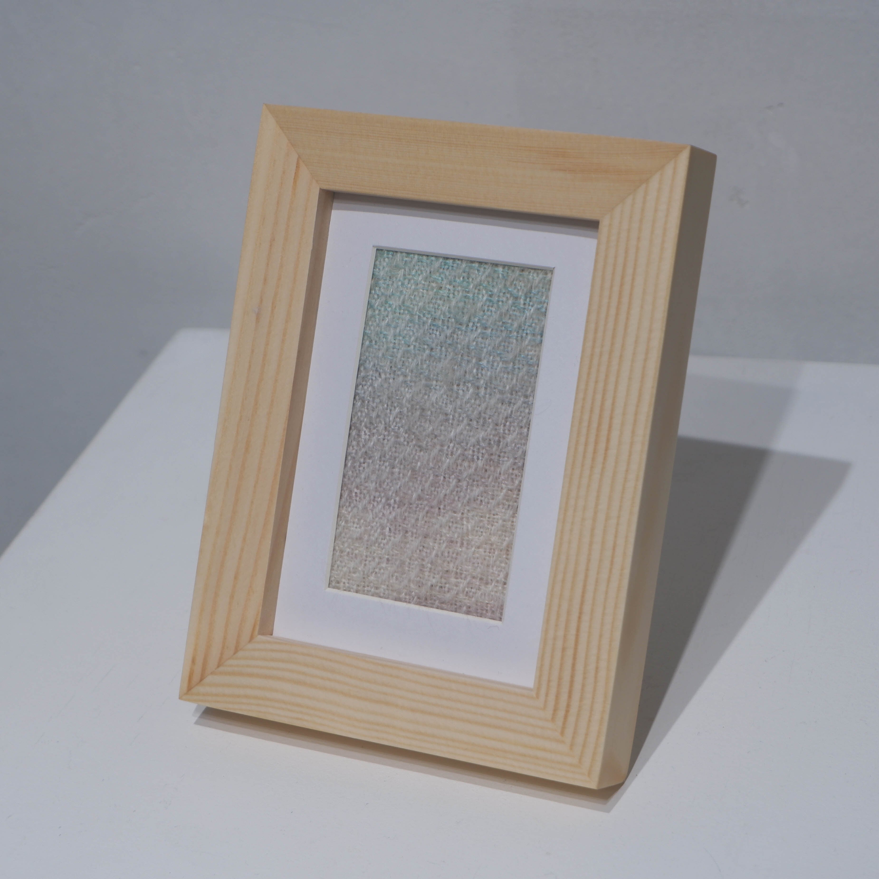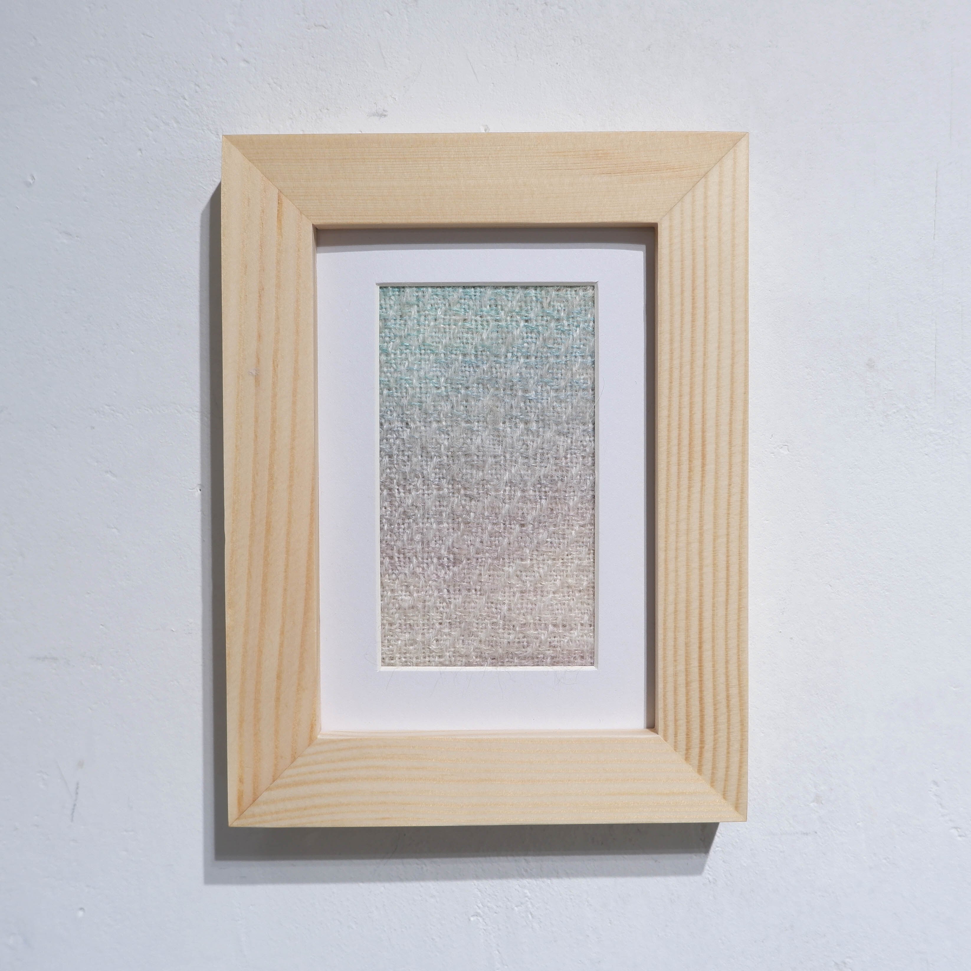 刷毛染めで絵画的紋様を施した経糸と、数種類の色・素材の緯糸を用いて布を織り上げる絵絣(えがすり)という技法で制作された繊細な色彩が抒情的で美しい作品です。